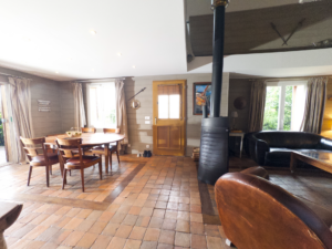 Salon avec canapé cuir club et poêle central